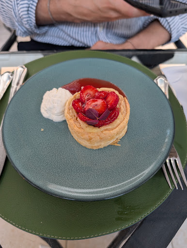 Read moreWe were here for dinner and we sat outside. We were welcomed by the hotel staff to the lounge area first because the restaurant wasn't ready yet, where we enjoyed beautiful live jazz music and a margarita. Afterwards, we entered the garden where there was a lovely breeze and atmosphere. The staff is very attentive and the experience throughout the dinner was good. We went for the set menu 75€ for 3 courses. As starters we took a cucumber salad and a meat pie, both very good. As mains we went for the pigeon and the chicken. My favourite dish was the chicken because it is paired with an interesting corn sauce and some popcorn as decoration. The desserts were also delicious but overall I would say the cuisine is quite...