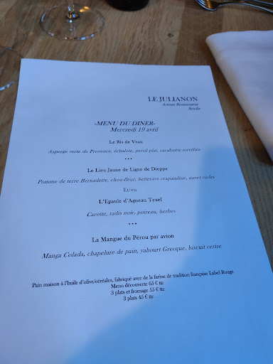 Read moreNous sommes très heureux de partager cet avis, d'autant plus que nous avons bien failli devoir remettre à plus tard la découverte de cette très belle adresse, ayant l'habitude de réserver à la dernière minute, selon les envies du moment. Chance! 10 minutes après que nous avions raccroché, la patronne nous rappelle pour nous dire qu'une table vient de se libérer! Elle est pour nous! Que dire du Julianon? C'est tout simplement un vrai coup de coeur! L'ambiance est feutrée et chaleureuse ; le service est souriant et efficace. Et le chef vient naturellement et en toute simplicité à la rencontre de ses clients, pour nous partager son inspiration du jour, toujours d'une finesse rare et alliant des saveurs souvent originales. Nous reviendrons pour sûr au Julianon et vous invitons à en faire autant, d'autant que les prix sont abordables au regard de la qualité de la prestation. Bravo à vous et à...