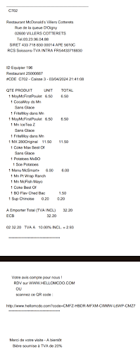 Read moreJe connais cette franchise parfaitement ayant eu plusieurs expériences professionnelles par le passé en tant qu'étudiante mais malgré les facilités mises en place depuis nombreuses années, il est difficile d'avoir une commande complète en un temps raisonnable pour un fast food. Aujourd'hui, encore une fois, j'ai 2 commandes dans la même voiture pour une trentaine d'euros chacune. Je me suis retrouvée avec 10 boissons au lieu de 7, des frites à refaire mais qui n'ont pas été refaites après 40 min d'attente au drive pour un mercredi soir où personne était en salle et juste une voiture devant moi au drive. Étant précisé que les deux commandes ont été réalisées et payées via l'appli McDo, il n'y avait plus qu'à scanner. Équipiers dépassés, et le manager qui a repris les commandes pour vérifier si c'était bon m'a redonné la même chose puis m'a parké au bout de tant de temps d'attente! Autant dire que résultat en arrivant sur Villers-Cotterets même, tout était froid! L'avantage c'est d'avoir eu des boissons coupées à l'eau en plus et des sauces d'habitude payantes, qu'on a eu à foison ! Heure de paiement/scan à la borne 21h41. Heure de départ du drive avec sacs : 22h25! Quand ce ne sont pas les frites qu'on fait avec les boissons, ce sont les glaces, histoire que ce soit déjà fait plutôt que de réfléchir en bonne intelligence et surtout en bonne logique. Pourtant eux-mêmes sont clients de ce type de franchise et reproduisent ce qu'ils n'accepteraient pas qu'on leur...
