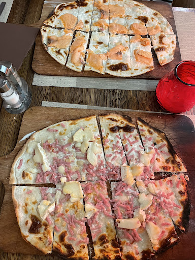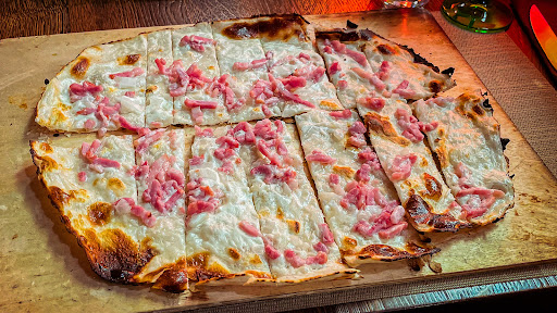 Warm restaurant dishing up sweet & savory tartes flambees, along with standard mains & desserts.