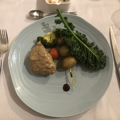 Commençons par l'amuse-bouche, un potage au petit marron fut surement réchauffé vu qu'il n'était pas très chaud d'un côté. Le bretzel, était dur comme s'il a été acheté la veille. Nous avions donc mal commencé L'entrée fut du foie gras avec un confit d'oignon. Le foie gras était correct mais était de type recomposé et avait un gout de pâté caractéristique du foie gras bas de gamme. Pour le confit d'oignon, c'était encore pire un arrière-gout était présent et non identifiable qui était très désagréable. Nous n'avions même pas fini le plat. Ensuite ce fut une saint Jacques salade de chou et risotto noir. Le saint jacques était bonne mais était un peu froide, elle a été mangée. Pour le chou, pareil mais ressemblait à une salade que l'on retrouve dans les restaurants asiatiques. Enfin le risotto noir était très fade, il n'avait aucun goût et était froid. Je n'avais rarement mangé un risotto aussi mauvais. Nous avons mangé 2 cuillères. Ensuite nous avions eu le plat. Une viande trop cuite sans saveur. Nous n'avions même pas mangé la moitié. Heureusement qu'il y avait des accompagnements présents. Pour le fromage, il était bon mais avait le gout de frigo ! Ma femme qui raffole du fromage a été très déçu. Enfin nous avions aussi eu un trou normand glace a moitié fondue et un peu recongelée vue la présence de glace avec du rhum. Je l'ai mangé même si ce ne fut pas exceptionnel. Enfin nous terminons le repas par la même glace avec ce que je suppose être de la chantilly de chocolat très fade d'une couleur brune très clair avec des morceaux de chocolat rond et identique qui sont trop parfait pour être maison.
