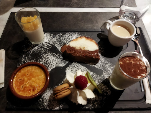 Devanture originale et on remarque bien la tête de boeuf sur la façade insi que le nom du restaurant de loin. Il est idéalement placé à côté de la grande roue. Nous étions partis pour manger dans un autre resto de la zone mais il n'y avait plus de place avant 21h30. Nous avons opté pour la côte de boeuf et ce fut notre première fois. Nous avons jeté un coup d'œil sur la carte à l'extérieur et nous avons un peu hésité à cause des prix. Nous sommes finalement entrés pour décourvrir et n'avons pas été déçus. Nous avons bien été accueillis et placés. La déco du resto est très sympa (il fait aimer le noir), les lustres sont bien disposés et originaux et le grand sur le mur reflète la salle...les banquettes capitonnées et en velours sont très confortables. Un serveur est venu nous voir pour savoir ce que nous voulions boire. Nous avons reçu la carte des plats et des desserts. Il est venu accompagné d'une grande ardoise mobile avec d'autres suggestions. Les explications étaient très claires et rien qu'à son assurance, on pouvait deviner qu'il connaissait bien son sujet. 😃👍 Nous avons finalement pris un cordon bleu de veau gratiné au munster et jambon accompagné de tagliatelles servies séparément dans un petit saladier en faïence blanche et un steak tartare servi sur une planche avec un jaune d'œuf en son coeur et dans des petits ramequins noirs, il y a avait les condiments (câpres, oignons ciselés et cornichons coupés en morceaux). A côté de ce steak tartare, il y avait des frites en accompagnement et une salade en supplément. Le serveur fort sympathique a même proposé de la sauce Worcestershire (difficile à prononcer..😂😂) et du tabasco pour agrémenter le steak tartare. Les plats étaient vraiment savoureux. La viande du steak tartare était très fraîche. Quant au cordon bleu, nous avons été surpris par sa taille car il recouvrait la largeur de l'assiette. La viande était tendre et ça se voyait que c'était du fait maison...👍 Les prix qui nous ont surpris au 1er abord semblaient vraiment justifiés pour le coup vu la quantité dans nos assiettes. 👍 Il nous fallait bien sûr finir sur une petite note sucrée 😃..Une dame blanche pour ma part disposée dans un grand verre avec des couches successives : chocolat fondu et chantilly au fond glace vanille, chantilly et chocolat pour finir. Un pur délice et je n'en ai jamais vu d'aussi grande....😃 Concernant l'autre dessert, c'était un café gourmand... Il était disposé sur une ardoise noire. Avec le sucre glace étaient représentés une cuiller et une fourchette. Le café gourmand était composé d'un café, une panna cotta avec des dés d'ananas par dessus, un tiramisu dans une verrine, un petit macaron, une tranche de glace bi-couche, une crème brûlée et une grosse noix de chantilly surmontée d'une belle framboise. Nous avons bien apprécié. Nous recommandons vivement ce restaurant car il est rare de nos jours d'avoir dans nos assiettes de la qualité et autant de quantité. Les prix proposés sont vraiment justifiés. Nous tenons aussi à remercier le personnel pour son accueil et le serveur pour son professionnalisme, son humour(quant à la quantité des plats servis et aussi de nous proposer une côté de boeuf après le dessert. 😂😂). Nous sommes sûrs d'y retourner dès...