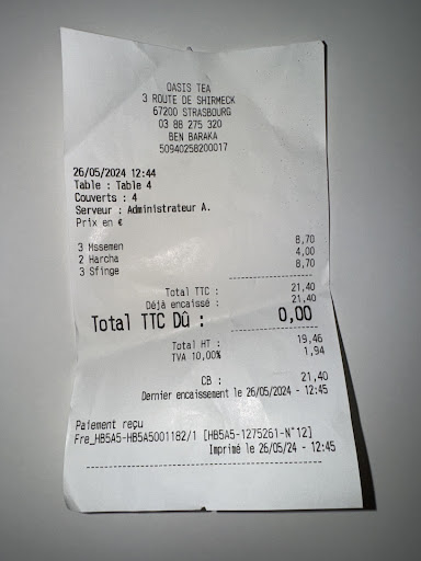 DeuxiĂšme expĂ©rience ce dimanche 26 mai 2024 Ă 12 :44 : Jâappelle le salon de thĂ©, 1 femme dĂ©croche, je lui demande sâil reste des âSfingesâ, elle me rĂ©pond combien ? je lui stipule le nombre 7, elle mâindique ensuite quâil en reste 4. Je lui demande de me les rĂ©server les 4 et que jâarrivais dans 10 minutes. Elle mâa rĂ©pondu âje vous les rĂ©serveâ. A mon arrivĂ©, et devant mes yeux, sa collĂšgue (avec ses Ă©couteurs, sans 1 bonjour, sourire ou mĂȘme 1 regard) prend 1 âSfingeâ et le sert Ă un client. Finalement, jâaurai le droit Ă 3 âSfingesâ qui ne sont pas terribles : texture beignet, 3 âMssemensâ et 2 âHarchasâ pour 21,40...