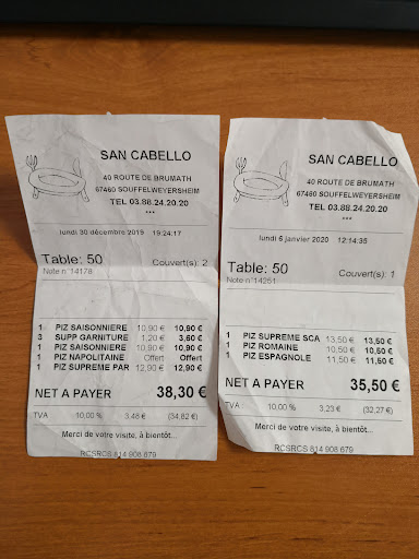 Read morePremiĂšre expĂ©rience chez San Cabello et belle surprise ! Les pizzas sont gĂ©nĂ©reusement garnies et de belles tailles, parfaites pour rassasier sans laisser cette sensation trop lourde quâon peut parfois. La pĂąte fine est un vrai atout : lĂ©gĂšre mais goĂ»teuse, elle permet de profiter pleinement de la garniture et surtout de finir sa pizza sans peine â un vrai plus ! Nous avons optĂ© pour une commande Ă emporter et avons apprĂ©ciĂ© la remise de -40 % sur la 2e pizza (il faut bien le prĂ©ciser au moment de commander, donc pensez Ă le mentionner đ). Niveau goĂ»t, un coup de cĆur pour la Passioneta et la Parma. Enfin, un mot sur lâaccueil : le cuisinier/serveur est trĂšs sympathique, souriant et agrĂ©able dans lâĂ©change. đ Une adresse que je recommande sans hĂ©siter pour de bonnes pizzas Ă emporter dans le secteur...