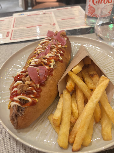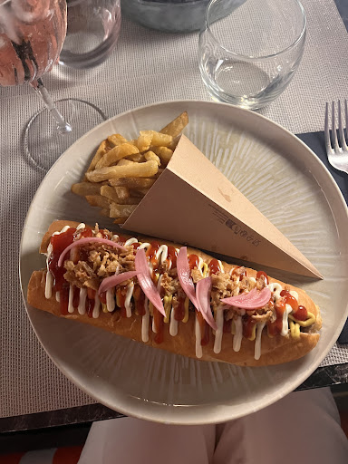 Les entrĂ©es que nous avons partagĂ©es Ă©taient parfaites. Nous avons ensuite pris un burger et un hot-dog : le burger Ă©tait bon, le hot-dog manquait un peu dâassaisonnement. Les frites, qui ont l'air fraĂźches, Ă©taient quant Ă elles sĂšches et molles, comme si elles avaient attendu un moment sous une salamandre.