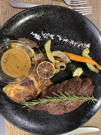 Das Steak (Bavette de boeuf) auf den Punkt getroffen und geschmacklich besser hervor gehoben, als manch ein Rinderfilet oder Entrecôte es könnte. Mit Raffinesse abgeschmeckt und optisch sehr schön angerichtet. Der Seeteufel war auf den Punkt getroffen, schön glasig, kein unangenehmer Beigeschmack absolut frisch, in Kombination mit den Beilagen, bei beiden Tellern ein gelungener Anblick und geschmacklich top.