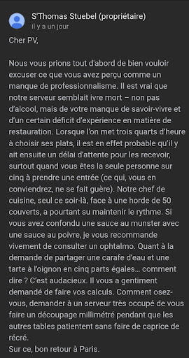D'une part, je tiens à féliciter votre chef de cuisine qui a su nous servir de très bons plats, je ne le critique pas et je ne critique pas le retard. Le retard n'est en soit pas problématique, mais l'oublie d'un plat un peu plus. Plat que vous persistez à oublier étant donné que vous ne l'avez pas mentionné une seule fois dans votre réponse. Si je dois consulter un ophtalmo pour avoir confondu une sauce poivre et munster je vous conseillerai à vous de consulter un orl, nous avions commandé une sauce poivre et deux sauces champignons. Pas de sauce munster. Je peux comprendre qu'on puisse faire des erreurs, mais si la horde de 50 personnes est difficile à gérer prendre un bout de papier et un stylo pour être sur de se rappeler de la commande n'est pas impossible. Nous n'avons pas demandé de séparer une tarte à l'oignon en 5, mais de payer ce que chacun a consommé, mais je vous pardonne, votre otite a du à nouveau vous empêcher de comprendre. C'est vrai que je suis susceptible, entendre "Bah va falloir me faire le calcul" à l'impératif en ayant gentiment demandé si nous pouvions payer ce que chacun a consommé est un caprice de récréation. Je ne savais pas qu'on donnait des ordres à ses clients, sans doute à cause de mon déficit d'expérience en matière de restauration. Je ne savais pas non plus en écrivant mon avis, que hésiter sur un plat était un manque de savoir vivre et que de vouloir consommer une entrée était une forme d'irrespect. Je remercie votre professionnalisme de me l'avoir fait comprendre. Comment osez-vous reprocher à vos clients, de prendre une entrée, d'hésiter sur un plat et de vouloir payer séparément... comment dire ? C'est audacieux... Que vous pensiez qu'écrire un avis respectueux et qu'avoir les mêmes attentes que celles que j'ai en allant dans un fast food, c'est-à-dire avoir ma commande complète, fait de moi un parisien, alors vous me fait honte. Je...