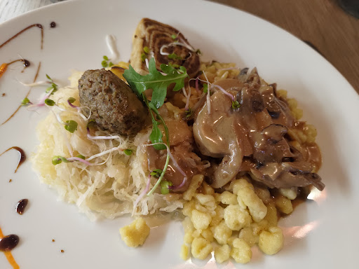 Such a shame because I really wanted to love this place, but it was just a disappointment. I was excited to try something new - the fleischschnakas - and my very first bite had a long hair wrapped all in and around it. Yuck!! My boyfriend’s sauerkraut was cool in the middle portion and was flavorless. My plate had a good flavor, but I also had the feeling that it had just been nuked in the micro because we arrived at opening and had our meal within ten minutes of ordering. My small salad and dressing was delicious - the best part of the meal. We wanted dessert but were afraid to try. Too, too bad because it’s a very cute space in a quaint little town....