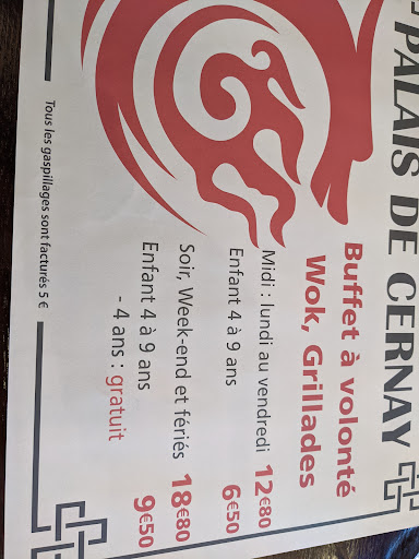 Pour info nous avons testé ce soir ce chinois à volonté "Le Palais de Cernay " alors voila pourvtous ceux qui aime mangé chinois à volonté ou pas surtout et par pitié ni allez pas , alors autant l decors est superbe que la bouffe est decongele et en.plus c est froid , tu mange ok ta même pas fini qu il vienne voir tte les 3 sec si ta fini , et te debarasse Oki j veux bien quand ta fini tu met tes assiettes au bord de table et il debarasse en passant mais la 🤔🤔🤔🤔 taeme pas le temps... Franchement j aime les crevette langoustine etc.. J adore même mais quand ti mange et que tu te dit oups sa est ps feais et quevtes crevette sont encore congelé heuuuu non suis desolee je paie donc j estime que se doit etre frais surtout pour du poisson et crustacé ... Bref c est deg... Meme les ananas pas frais et.pourtant c est un fruit qui se tiens la glace citron vert ta l impression qu il y a de ka naphtaline 😈😈😈 rien que dy.penser j ai envie devre gerber oui oui re gerber suis rentrer direct j e ai vomi ... Bref... Sa c est dit.. Mais le pire pour le paiement on a divisée en deux pour 4 personnes rien de bien compliqué, et ben non la deuxiemz personne a eu un montant de 4,40€ en plus , oki vous me direz bon ccewt pas la mort sa arrive ...mais meme en rectifiant pour 4,40€ elke c est.planté... Vous imaginez 4 ou 5 € a chaque cluent waouhhh le pourboire edt imlense. Et je ne suis pas la seule les clients apres nous pour le paiement idem c'ewt trompé 1 fois j veux bien que tu.puisse te trompé .mais deux et ka suite heuuu gros souci. Encore bref ... J aime le chinous mais la friterie le mondiale a mulhouse est meilleur et jamais ete malade alors voila prevenus vous etes a vos risque et peril... C est deg ... Honteux pour des plats a risque de.maladie . J espere juste que personne ne sera.tres malade ... Voila..... ...