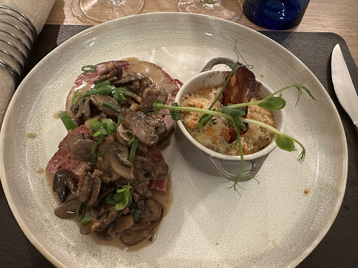 Started off with a nice cocktail well prepared and lightly garnished . We were offered an amuse-bouche to start of the meal . Veloute of beef with small pieces of beef : delicious . For main course I chose the stuffed veal with mushroom sauce and hints of bacon , which was accompanied by a vegetable truffled gratin. Both were outstanding with red wine from the Rhône it paired and balanced very nicely .
