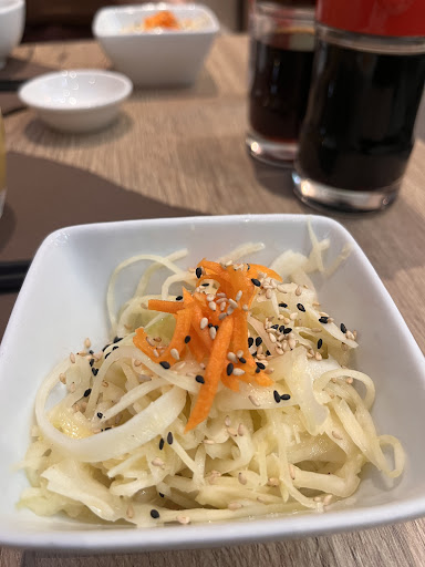 C'est assez cosy Ă l'intĂ©rieur, y a des banquettes, pas mal de tables, assez d'espaces entre elles pour que je puisse passer et qu'on ne puisse pas trop Ă©couter les conversations des voisins. Rapidement on nous sert de l'eau (trĂšs bon point), et la carte est allĂ©chante mĂȘme si j'ai Ă©tĂ© un peu déçue du manque de raviolis lĂ©gumes/vĂ©gĂ©tariens dans les menus. Oui, y a pas mal de menus, mais le manque de personnalisation ou d'options vĂ©gĂ©tariennes c'est dommage. Exemple, pourquoi pas insĂ©rer des gyozas aux lĂ©gumes avec des makis avocats ? Ou pour les non vĂ©gĂ©s, un plateau Ă personnaliser ? J'ai donc pris le matsu vĂ©gĂ©, mon amie les gyozas, mon compagnon le menu Osaka, et j'ai aussi pris 12 tranches de sashimi saumon (16 euros tout de mĂȘme pour les tranches^^). Chaque menu est accompagnĂ© d'une soupe miso et d'une salade de choux, je n'ai pas l'impression qu'on puisse changer cela, Ă voir ? C'est bien et assez copieux, donc le rapport qualitĂ©/prix est bon pour ma part. Tout Ă©tait bien frais, excellent, les sashimis fondaient en bouche... un vrai rĂ©gal. Le wasabi ne piquait pas assez Ă mon goĂ»t, si vraiment je peux trouver un dĂ©faut sur les accompagnements.