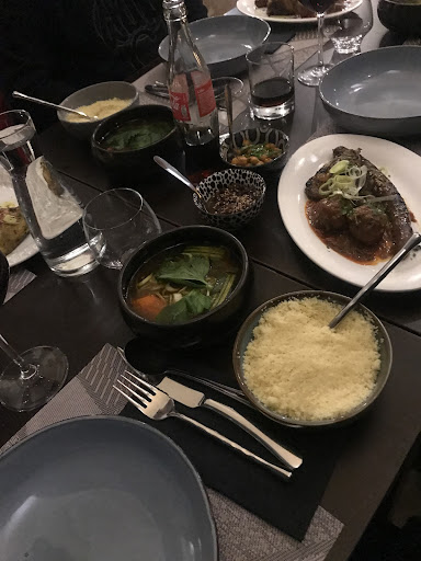 Je dois dire que la décoration du restaurant est magnifique, avec les jeux de lumière des nombreuses lampes c'est superbe. Heureusement qu'il y a toutes ces lumières .Tout est noir à l'intérieur les murs , nappes ,vaisselle c'est sombre et oppressant, mais surtout il y a le bruit !!!!!!! un brouhaha pas possible, impossible de parler avec les autres convives même à côté de moi . Difficile pour le serveur de prendre la commande.C'est un hall de gare.Le couscous était bon mais sans plus Tout était servi individuellement, beaucoup de tralala pour rien . Et trois fois on a d'abord oublié mon apéro, puis ma brochette et en dernier le dessert pas de bol c'est tombé sur moi ......Un couscous c'est convivial, on mange, on rigole on parle .On se ressert, on mange plus qu'il n'en faut mais là pas possible . Dimanche dernier j'étais à Thionville dans un restaurant le H ---- pour manger un coucous royal nous étions 14 personnes. Nous avons mangé avec plaisir ,dans le calme , on a parlé, rigolé et le couscous était excellent !!!!!!! Le restaurant plus grand était aussi presque complet En plus nous sommes repartis avec un doggy bag......... Pour conclure: cher pour la qualité et la quantité . Nous sommes plusieurs à le penser .Pour répondre à votre question j'étais là hier soir table de 10 à gauche près de la fenêtre. Effectivement la brochette était servie sur un plat blanc et le minuscule samoussa sur une assiette colorée,mais le reste de la vaisselle, assiettes, bols , petites coupelles pour les rasins et sauce étaient noires, ou marron foncé ou anthracite😂, la nappe et les serviettes aussi .Je peux vous faire parvenir la photo prise par le serveur ou peut-être vous pour vérifier que la nappe est noire. Dommage que nous n'avons pas fait de vidéo on aurait eu le son en prime . Loin de moi l'idée de vous blesser, on est en démocratie , j'ai le droit de dire et penser que certaines choses ne me plaisent pas . C'est la faute à Mr Google😂, avant on râlait dans le dos des gens maintenant on leur fait savoir . Vive...