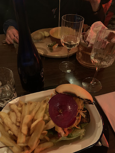 Read moreLe Fer Rouge is een bar en restaurant met eigen gebrouwen bier. Wij waren hier met een groep van 7 tijdens het happy hour. 18:00 tot 19:00 Aansluitend hebben we in het restaurant op de eerste verdieping gegeten. De inrichting van de bar is gezellig met een hoop zitjes en voldoende staanplaats aan de bar. Een pint kost tijdens het happy hour 3 euro en anders het dubbele. Deze prijs is ruim voldoende voor de kwaliteit van het bier dat geschonken wordt. Er was een keuze uit 6 soorten en de enige die enigzins bijzonder smaakte was de stout. De rest van de bieren zat niet voldoende koolzuur in waardoor ze een beetje laf smaakten. Het personeel in de bar was helaas ook niet al te vriendelijk. Om 19:00 zijn we naar onze gereserveerde tafels in het restaurant op de eerste verdieping gegaan. In tegenstelling tot het personeel in de bar bleken de mensen in het restaurant wel te begrijpen hoe je gasten behandeld, prima. Het restaurant werd ons aangeraden om zijn geweldige hamburgers, dit is helemaal waar. Een groot stuk vlees,prima gegaard met gecaramaliseerde uien en verse sla. Tevens werden hierbij lekkere frieten geserveerd met saus naar keuze. Echt lekker. €18 Deze zelfde burger is trouwens tijdens het happy hour in de bar te bestellen samen met een pint voor €15 Parkeren voor de deur is met veel sneeuw een beetje lastig. Kortom, leuke tent, bier kan beter, prima burgers en personeel misschien eens...