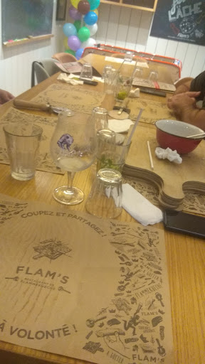 Client de l'hôtel Ibis Style qui se trouve accolé au resto Flam, je me suis laissé tenter par facilité j'avoue. N'ayant pas forcément envie de manger de Flam's, je me suis dit chouette ils ont une assiette "Galette de pomme de terre, salade verte et fromage blanc aux herbes ", ça tombe bien j'adore ça . Ils me préviennent qu'ils n'ont plus de salade verte, ouille.....(inquiétant sachant que leurs entrées ne sont que des salades composées , mais bon...)Tant pis, je vais quand même prendre les galettes , peut-être qu'ils me mettront une demi tomate à la place (elles sont dans certaines de leurs salades) ou alors une galette en plus.... L'assiette arrive, hummm j'ai faim!!!!! 2 galettes et un petit ramequin de fromage blanc aux herbes. Bref l'assiette est vide .Prix: 12,30€ Je précise que même avec une salade, ça m'aurait paru cher, mais là c'est une honte !!!! Je précise également que les galettes sortent du congélateur. J'ai pris une demi badoit : 4,40€ et un café :2,30€. Total :19,00€ (aucun geste par rapport à la salade en moins) et bien sûr je suis ressorti avec la faim mais n'avait pas envie de continuer l'expérience. Peut-être que ceux qui mangent les Flams sont mieux servies. Je mange au resto tous les jours, un conseil, continuez les Flam's et arrêtez le reste, c'est du Vol. Ils ne me reverront jamais !!!! Derniere chose, vos cuisiniers aiment le rap et ils en ont bien le droit mais de là à en faire profiter toute...