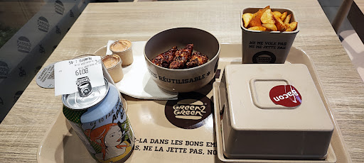 Read moreUn bon repas pour le déjeuner, quoi qu'un peu cher, même si cela est bio et que l'endroit et presque auto-suffisant (Leur comm étant basée sur l'écologie). Vous trouverez tant des options pour tout.es comme avec des steaks, mais aussi des options vegan comme des nuggets curry pois chiches et des galettes courgettes. Le repas était bon, il manquait cependant un peu de sauce bbq dans le BBQ VG Spicy. Le service cependant est à revoir. Pour une cinquantaine d'euros de commande pour deux (Ce qui est très conséquent tout de même), je me suis vu refuser par le management un fond de sirop de grenadine alors que j'avais acheté une limonade (Pour faire un diabolo). J'ai dû repayer 1€60 pour pouvoir avoir un fond de limonade et de l'eau !!! Je comprends qu'il y a toute une gestion de stock, ou même de procédures et qu'il y a un fonctionnement spécifique dans un fast food, mais il faut cependant savoir être parfois flexible tout de même, surtout si vous souhaitez effectuer de la vente additionnelle. Nous souhaitions prendre des desserts et un café, et cela nous a refroidi sur le service, et n'avons pas pris de dessert chez vous finalement. Sur la commande, il y a eu beaucoup d'oublis, et ce même après être allé voir l'accueil. Pas de sauces lorsque nous avons eu la commande, après avoir réclamé la BBQ, Ketchup et Mayo, nous avons eu BBQ spicy et Ketchup, j'ai dû repasser à l'accueil pour la mayonnaise et nous n'en avons eu qu'une alors que nous avions commandé deux comme il était inclus dans le menu. De plus, nous sommes partis à 17h30, et ce collaborateur qui nous a servi était présent et ce depuis 7h30 ! Je comprends donc pourquoi il y a eu toutes ces erreurs et un service moins bon. Et cela n'est pas de sa faute. La qualité ne peut pas être celle que l'on attends d'un établissement qui communique tout de même sur le bien être humain, et qui fait travailler ses collaborateurs plus de 10h par jour ! Cela ne peut coïncider ! En bref, le repas était bon, certaines choses auraient pu être améliorés, mais le management doit vraiment être à revoir tant sur le plan humain que sur la vente, car nous avons été franchement déçus de notre première expérience. Nous ne reviendrons...