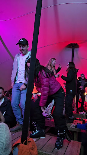 Ce fut le meilleur après ski de notre existence. La mayonnaise prenais petit à petit alors que nous finissions notre repas à l'intérieur, et c'est agréablement surpris que lorsque nous sommes sorti du repas nous avons découvert un dance floor endiablé, la musique étais inter générationel et l'ambiance a faire rougire de jalousie bien des Folies douces.