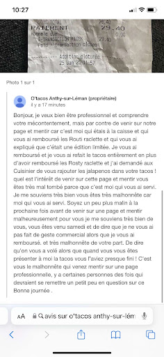 En plus d’être des voleurs, vous êtes des menteurs, vous n’avez pas honte ? Mon frère s’est plaint dans les commentaires que vous n’aviez pas mis les deux suppléments dans deux tacos (dont le mien), et cela, en connaissance de cause, cela s’appelle du vol ! Pour preuve, vous nous avez expliqué qu’il ne restait plus de rösti en stock, malgré le paiement de celui-ci ! De plus, vous expliquez dans votre commentaire que vous avez fait un geste commercial en remboursant le vol. C’est ça, un geste commercial pour vous ? Mon frère a à peine mangé une bouchée de son tacos XL, qui a été remplacé par un L, un grand merci pour ce geste commercial, bravo et encore merci. Quand vous n’avez pas un ingrédient en stock, la moindre des choses, c’est de prévenir ! Si nous devons vérifier chaque tacos pour éviter le vol, on n’en finit plus. Enfin, je ne vois aucun intérêt à mentir. C’est de la prévention pour les futurs clients. Quand on fait mal les choses, on assume, au lieu de traiter les gens de menteurs. Ps: je réponds à votre commentaire que vous avez pris le soin d’effacer encore quelque chose que vous assumer pleinement bravo (le commentaire et posté en photo)
