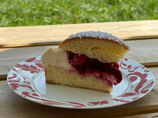 Nous avons été très incités à prendre des desserts et comme nous n’avions plus faim (trop gourmands sur les pizzas😇) nous les avons pris à emporter. La carte des pâtisseries est variées originale et tous sont de petites œuvres d’art visuellement. Tout comme les pizzas les parts sont généreuses et tout donne envie. Mon gros bémol vient ensuite. Nous avons pris la tropezienne aux framboises, que mon fils a trouvée très bonne. Nous avons pris deux parts de tarte aux myrtilles (mon péché mignon) mais comme la composition n’était pas détaillée j’ai demandé s’il y avait une crème et auquel cas laquelle. La jeune personne (très gentille soit dit en passant!) qui m’a répondu m’a dit «crème pâtissière », ce qui était parfait! Et à la dégustation c’était une bas de crème d’amandes, chose que je n’aime pas du tout. Selon mes goûts le rendu était lourd et compact malgré une belle épaisseur de myrtilles (qui par contre étaient délicieuses). Au final et selon mes goûts c’était très (trop) beurré, pâte un peu trop épaisse et crème d’amandes qui alourdit encore le gâteau… dommage. En fait j’aurais juste aimé qu’on me donne la description exacte du gâteau, ça évite les déconvenues…