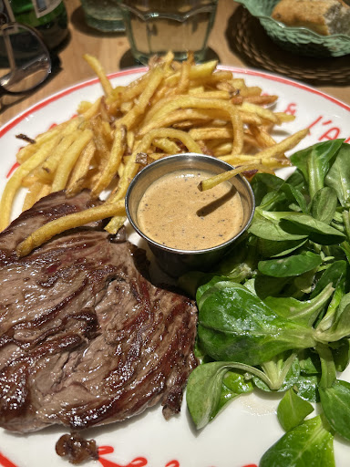 Cocktail sans alcool : bcp bps de petits glaçons dans le verre pour au final 4 gorgées de cocktail ... Entre autre, le serveur est tellement pressé qu'il débarrasse les verres avant même qu'on ai fini. Obligées de le stopper 2 faux filets avec 1 cuisson correct pour celle bien cuite et complètement ratée pour la saignante qui était au final à point Très bonne qualité de viande, malgré la cuisson, elle était très bonne. Mâche et frites à volonté ! A aucun moment cela a été stipulé par le serveur, vraiment dommage car c est un point positif du restaurant ... (heureusement, nous l'avions vu sur la carte) Les frites sont très bonnes, bien croustillantes et la vinaigrette de la Mâche, une tuerie. Fondant au chocolat, pas fondant du tout et pas top ... dommage ! En ce qui concerne, l'énooorme profiterole , on ne s attend pas à ça ! Cela nous a valu un bon fou rire au moins à défaut de la manger ! Effectivement il est écrit énooorme profiterole ... mais le serveur pourrait encore une fois prévenir que c'est pour minimum 2 personnes ou... un ogre ! Il y a énorme et énorme 🤷♀️🤦♀️..et malheureusement en plus elle n'a pas été à mon goût... ni celui de mon amie qui a essayé de m aider à la manger ! Le chou est industriel et congelé, ç'est vraiment pas très bon