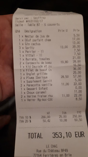 La cuisine malheureusement n'est pas à la hauteur de ce qu'on peut imaginer. Rien de très original, c'est une carte comme on peut en trouver dans toutes les brasseries/bistrot un peu soigneux, il n'y a pas de plat "signature" ou d'esprit le Chai. La présentation est plus qu'à revoir pour les prix pratiqués, aucune recherche, pas d'harmonie de couleurs, et les éléments disposés sont bâclés, vaisselle lambda. "L'apéritif" à 15€ avec 4 malheureuses crevettes panées panko servi dans un verre m'a quelque peu déstabilisé. Quant à la cuisine, le tartare était préparé correctement, mais la viande était grisâtre, et manquait clairement de fraîcheur. La salade est oubliable, et les frites ok. Tataki de thon en face de moi, cuisson non maitrîsée, car lui aussi quasi gris, donc clairement trop cuit, et accompagnement qui ne vaut pas la peine qu'on en parle. Cependant, présentation, choix et qualité des desserts à garder, tout est parfait ! mais de mémoire, ils proviennent d'une pâtisserie alentours donc pas faits sur place. Choix des vins plus qu'honnête et prix alignés, rien à dire. Dernier point négatif, le service. Le personnel de salle est diablement efficace, ils se démènent et ça se voit, cependant, ils sont clairement en sous effectif aussi et ça se voit encore plus. Prévoir 2h10 pour un vendredi soir et pour seulement apéro, plat, dessert, c'est beaucoup trop (et nous n'avons pas pris notre temps). Le potentiel de l'endroit est juste fou, mais on sent une envie de capitaliser sur l'aspect plutôt que sur l'expérience, et ça ne me donnera pas envie de...