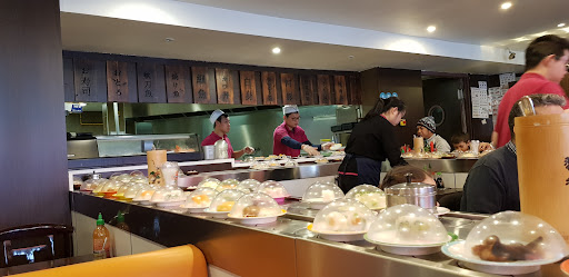Restaurant japonais Ă volontĂ© avec le service sushi train. TrĂšs Ă la mode oĂč on se sert soi mĂȘme les petits plateaux de sushi ou autres.