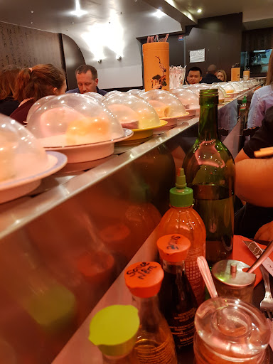 Restaurant japonais Ă volontĂ© avec le service sushi train. TrĂšs Ă la mode oĂč on se sert soi mĂȘme les petits plateaux de sushi ou autres.