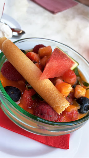 Nous avons fini nos assiettes quand les 2 verres de vin arrivent, accompagné d'une carafe d'eau tiède... Nous sommes allés ailleurs prendre le dessert. Je déconseille fortement ce restaurant. La viande était bonne, le reste zéro ! Une cantine à viande pour brassé du touriste...