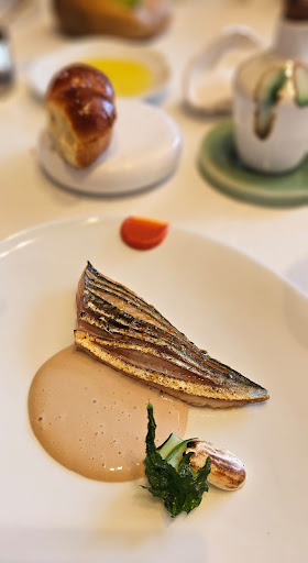 Food: The food, except perhaps the sea bass, which had a wonderful combination of flavors and the taste buds were touched for the first and last time, was completely inexpressive. I didn't remember anything else from this dinner. It's good that they put salt on the table at the very beginning, and it was possible to add flavor to the dishes. Because some of them were rather bland. And I'm not saying this because I like saltier dishes, it's a matter of bringing the ingredients to their ideal taste. The pre-dessert was cloyingly sweet, although you could feel an attempt at sour flavors, but the pastry chef overdid it with the sugar in the sauce.