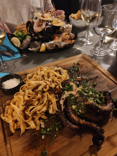 Pour les poulpes, nous avons demandé à avoir des frites plutôt que des tagliatelles : deux assiettes sont arrivées avec des moitiés de poulpes pas fraîches (donc 4 tentacules qui se court après) et un bol de frites. Même pas un peu de déco, ni une petite feuille de salade: une assiette à 30 balles!