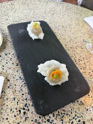 Entrées:"L'oeuf parfait", et... il porte bien son nom, entre l'oeuf cuit a basse température, les truffes rùpées - a choisir!!! "Le velouté d'amande", délicieux avec de la brousse et un confit de tomates ainsi que des tomates locales délicieux et trÚs frais pour commencer le repas