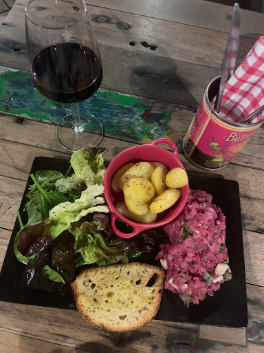 J’ai pris l’apéro + tapas à 5 € accompagné d’un verre de vin rouge de très bonne qualité : j’ai été sincèrement impressionnée ! Pour le plat, j’ai choisi le tartare basque (bœuf, basilic, Ossau-Iraty, échalotes, câpres) avec pommes de terre rôties au four et salade verte — un vrai délice. Justement équilibré au niveau du goût, généreux et parfaitement exécuté.