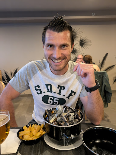 Nous avons commandé des moules frites (mariniÚres et roquefort), un steak, et un plat de saumon mi-cuit : Tous étaient excellents. Les moules étaient grosses et bien cuisinées, parfaitement assaisonnées. Si je devais noter un point moins positif (mais qui n'en est pas pour autant négatif), j'aurais rajouté quelques frites supplémentaires. (TrÚs bonnes)