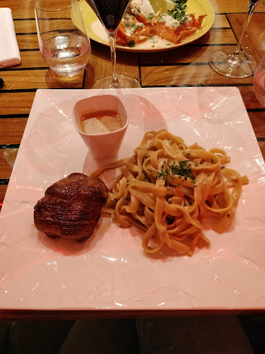 Concernant nos assiettes : Tagliata n'étaient pas des tagliata de boeuf, ou alors peut être un essai de faire une nouvelle présentation et préparation mais du coup on ne s'attend absolument pas à ça et on peut être éventuellement déçu ... Mais le prix reste correct. Le poulpe n'a pas été apprécié visiblement caoutchouteux (mais je sais que ce sont des choses qui arrivent mon compagnon étant lui même employé dans un restaurant en cuisine) Le croustillant de saumon rien à dire, bon rapport qualité prix. Une personne, la plus chanceuse a pris 2 entrée (Tataki de thon et assiette de la mer) qu'il a adoré et la également dit à votre équipe. Et nous revenons sur mon plat : Le filet de bœuf FRANÇAIS DE RACE CHAROLAISE ET SERVI AVEC UNE SAUCE AU FOIE GRAS ET DES TAGLIATELLES FRAÎCHE CUITE MINUTE À LA POÊLE AU BEURRE DE TRUFFE à 35,90€ ... Donc, toute la table a été choquée en même temps que moi de la taille du morceau. Qui malgré sa superbe provenance et race était loin d'être le meilleur filet de boeuf que j'ai mangé dans ma vie à ce prix ... Passons. Les tagliatelles fraîches, mais le goût de la truffe très léger et la sauce au foie gras était agréable. Permettez moi juste d'être déçue à ce prix là de recevoir une assiette telle que celle ci. Qui ne donne pas vraiment envie j'en suis désolée, n'était pas très travaillée et avec laquelle on reste sur notre faim. Quand on prend un plat à ce prix là je suis désolée de vous dire que l'on s'attend à mieux.