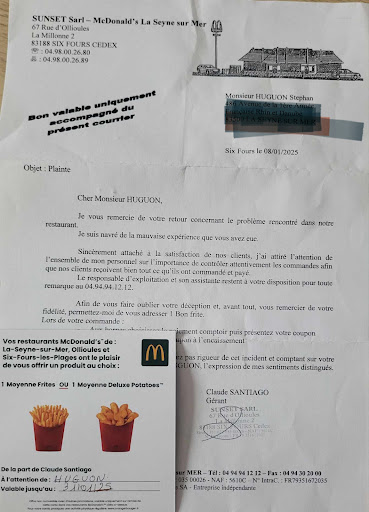Pour terminer afin que le manager soit bien reconnu et qu’il n’y ir pas de confusion pour une éventuelle sanction, il s’agit du manager du Mc Donald d’OLLIOULES en poste le vendredi 26 juin 2025 aux alentours de 21h. Bravo à...