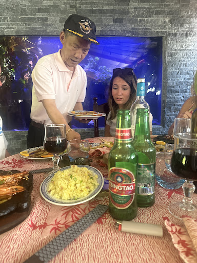 De passage dans le coin pour nos vacances nous avons voulu essayer ce resto. En effet la première salle ne paie pas de mine, l'accueil est très froid on nous indique juste d'un geste de la main d'aller au fond. Le boss nous accueille sans sourire, puis vient prendre nos commandes tout en étant toujours très froid. En attendant d'être servis nous observons les gens qui arrivent et qui je pense sont des habitués car le boss change d'attitude, il leur parle, rit avec eux, s'assoit même à table....alors du coup on se sent mal à l'aise car mal accueillis. Toutes les personnes sont servies rapidement mais pas nous... Dessert commandé, coupe de glace, rien à voir avec ce que j'ai demandé, au lieu d'un chocolat liegeois j'ai eu un café liégeois (sans la sauce chocolat mais avec du caramel...?) Bref... Sinon les points positifs sont les toilettes très jolies et propres Le chien qui se promène gentiment entre les tables, les poissons Les plantes partout ça j'ai adoré , c'est tellement beau. On y mange bien c'est assez copieux