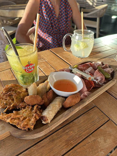 Nous étions 5 pour consommer des cocktails et des tapas. Tout d’abord les cocktails: pour les mojitos, il fallait chercher le rhum qui était très peu dosé et noyé dans la glace pilée. En plus la serveuses en a renversé en déposant les verres sur la table (ce qui peut arriver, pas de souci) mais elle n’essuie pas. Il y avait aussi un Spritz St Germain: il a été servi dans un verre tube, comme un Ricard! Pour accompagner les cocktails, nous avions commandé une planche de charcuterie et une planche de fritures (15 et 17€) . Là nous voyons arriver une planche ridicule sur laquelle tout est rassemblé. Voyant le peu de nourriture qu’il y avait pour le prix, nous avons cru qu’il y avait une erreur: le serveur nous a alors confirmé fièrement et en ricanant que c’était bien notre commande. Pour une planche de charcuterie à 15€, nous n’avions que 2 tranches de jambon cuit, 2 tranches de chorizo, 2 tranches de jambon cru, 2 cornichons et 1 morceau de beurre. Même pas de pain qu’il a fallu réclamer. Bien sûr, ce n’était pas de la charcuterie artisanale! Quant aux fritures, pour 17€, il y avait 2 beignets de légumes, 2 minis nems, 2 samoussas, 2 boulettes et 1/2 ramequin de sauce aigre douce. Franchement, c’est exagéré! Les restaurateurs se plaignent que leurs terrasses soient vides, mais à qui la faute?? Nous habitons ici et trouvions le cadre sympa face à la plage, mais nous ne reviendrons pas c’est certain! Ok pour payer un peu plus cher dans un cadre sympa avec vue mer, mais il ne faut pas non plus prendre les clients pour des vaches à lait!!! Surtout lorsqu’il s’agit de produits industriels et de surgelés . Au minimum, indiquez la composition des planches sur les cartes, ça évitera les mauvaises surprises! Je vous laisse juger les quantités sur la photo