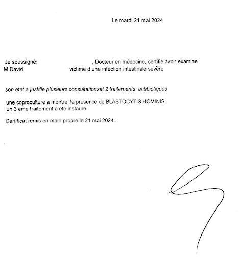 Détails des symptômes et traitements : Vomissements fréquents pendant 15 jours Tension artérielle tombée à 9 Perte de poids de 7 kg 5 Analyses médicales : (prises de sang, coprocultures) 3 Traitements antibiotiques 2 Arrêts de travail