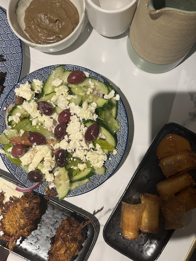 Όντας Έλληνας, ανυπομονούσα να βιώσω την ελληνική φιλοξενία και ποιότητα. Ενώ η ελληνική σαλάτα ήταν το αποκορύφωμα της βραδιάς, είναι ένα αρκετά εύκολο πιάτο για να φτιαχτεί. Οι κολοκυθοκεφτέδες ήταν αξιοπρεπείς, αλλά η πίτα ήταν σχεδόν ωμή, γεγονός που με απογοήτευσε. Η τυρόπιτα δεν ήταν φτιαγμένη με πραγματικό "φύλλο" και η σάλτσα μελιτζάνας είχε επίπεδη στη γεύση.