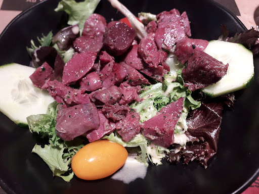 la planche mixte (charcuterie et fromage) n’avait aucune teneur en goût très décevant pour un boucher et les fromages venaient du super marché … -steak haché du Burger cuit au micro onde, nous l’avons vu de la cuisine (une honte pour un boucher) le tartare de bœuf avait une très belle APPARENCE (a l’intérieur il était avarié)