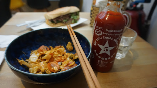 BÁNH MÌ "Sandwich vietnamien cuisiné avec du pain artisanal garni de carotte aigre-douce, de concombre, de coriandre et de viande au choix" • Bœeuf mariné poêlé 8,50 C The inner layer of the bread is coated with butter, which is smooth and soft. There is a lot of beef, and the seasoning is just right. It is served with carrots and cucumber shreds, which tastes good. The addition of coriander makes the dish more layered. The hot sauce on the table tastes like Indomie's seasoning packet, I like it.