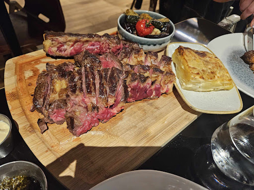 Nous sommes venus à 8 avec l'intention de déguster 3 côtes de bœuf. Malheureusement, sur ces 3 côtes, 2 étaient excellentes, mais une était tout simplement immangeable, semblable à un chewing-gum. Nous avons tout de même comparé avec la viande de nos amis pour voir si l’ensemble des viandes était comme ça ou seulement la nôtre. Et c’était seulement la nôtre… Croyez-moi, qu’à 69€ la côte de bœuf, cela est fort embêtant.