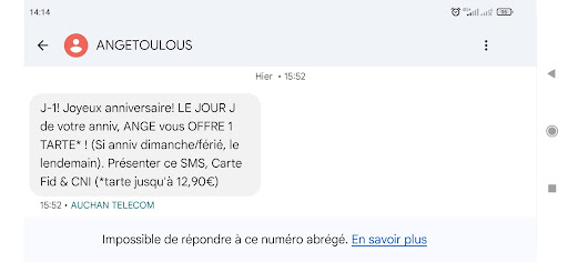 Read moreCelà fait deux ans que je viens très régulièrement acheter mon déjeuner à emporter dans cette boulangerie où j'ai toujours été satisfait de la qualité des repas et du service et pour laquelle j'ai naturellement adhéré au programme fidélité. Et j'ai eu la belle surprise hier de recevoir un SMS m'indiquant que j'avais la possibilité de venir récupérer une tarte à partager de mon choix offerte pour mon anniversaire ! De plus le personnel a été particulièrement sérieux et précis concernant mes questions sur les allergènes potentiellement présents dans les tartes afin que celà puisse également rester une belle expérience pour mes collègues ayant des allergies alimentaires. Du grand professionnalisme et une fidélité hautement récompensée, merci à toute...
