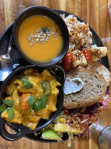 I loved this place! Love at first experience. Unexpected in a city like Toulouse truly. I went with a friend , not with my daughter this time. We sat on the floor - you can leave your shoes at the entrance (hidden in a covert) to get into this little wooden platform to sit legs-crossed on the floor. If ur not used better sit in the chairs. Vegetarian options are really good. I had a plate that had everything ! Even a little soup. I enjoyed every bite! They specialize in Vietnamese but fusion with a frenchy touch. I had the strawberry matcha… you should try the coffee with coconut milk, it only comes in a cold version… it’s das they don’t serve it hot. I didn’t try the cakes but they have such a good looking… next time I’ll try and let you know. Nice to spend time while drinking tea with a...