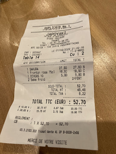 Read moreNotre restaurant japonais préféré étant fermé, nous avions décidé d'essayer le restaurant Japoyak. D'après les avis, il n'avait pas l'air trop mal. Je ferai court. Nous avions commandé un menu à 27,90euros comprenant une soupe miso, une salade fruits de mer , 8 brochettes (terre et mer) et un dessert (salade de fuit ou moshi). Lorsque je vis la salade chou fruits de mer arriver, il y avait deux fine lamelles de surimi sur la salade de chou. Ma fille avait prix un menu à 14,90euros avec entree, mix sushi et maki. Sa salade était exactement la même sans lamelle de surimi. Bref, apparemment il y a une salade fruit de mer améliorée avec 1 crevette au milieu me dit le serveur (si c'est pas prendre les clients pour des ....) Passons au plat de resistance. Ma grosse erreur fut de ne pas avoir pris de photo. Les brochettes mer (saumon, poulpe et grosse crevette) . Le peuple avait le goût du crâmé. Le reste passait encore. Passons aux brochettes terre: très sec, très salé, visuellement et gustativement clairement décevant. Le dessert, pourtant on a l habitude de commander des moshis , il aura suffit d'une bouchée pour reposer le tout dans l'assiette. La serveuse nous demanda si ça s'était bien passé et en tant que connaisseurs, on a heureusement de bonnes adresses, on a répondu de façon constructive mais au vu de la réaction de la serveuse, peu important notre expérience. Après cela, nous étions assoiffés (nous avions bu pendant le repas pourtant), la bouche pâteuse et la personne qui avait commandé le poisson cru a eu des crampes d'estomac. Les restaurants Sushi sont très à la mode, d'où l'engouement et le flux de clients d'où la qualité des produits qui s'appauvrit malheureusement et manque de conscience professionnelle. J'aurai dû retourner le plat dès la première bouchée. Cette expérience m'aura servie de leçon. Je ne me ferai pas avoir une deuxième fois. Les restaurateurs ont des devoirs auprès des...