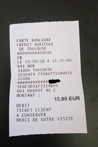 We ordered chicken curry, Peking duck, nem, caramel pork, shrimps with tomato sauce. The duck is fried rather than grilled. A Chinese restaurant near boulevard de strasbourg makes this dish much better and more reasonable price. The skin is hard and a bit raw. Tomato sauce is from bottle (industrial one) and has weird taste. Super disappointed about the nem (only pork and vermicelli, neither carrot nor black mushroom/onion). Banh mi Vietnam at rue des frères lions has the best nem in Toulouse. Caramel pork is too sweet. And the chicken is as white as my skin coz it's frozen one that supermarkets sell. The curry sauce is made of curry powder in small bottle from brands like Ducros. Cantonese rice is not Cantonese rice. I am Asian and I know how the food should be comparing to the price and the service. My menu was 12.90 euros (the one at bottom left in the middle column) and they wrote "crevette/canard lac" in the main dish without indicating that customers have to pay more for that. 1 euro is not a lot but they are cheating people using that misleading menu. Problems appeared when my friend paid with his credit card. The woman typed 13.90 euros but my friend's meal was 12.90. My friend did not take care and put in his card. Then a receipt came out of the machine (see my pic). And we just realized that it was the wrong price. Then she said that it was not successful and he needed to do it again. I said that the ticket was popped-out with the 4 last numbers of his card and the hour!!! She asked where the second ticket was and if it was successfully charged, there should be two tickets. Well I said I worked in a restaurant and she should have gone to the history to have it printed out. Sometimes papers can be out of stock or the machine has some technical problems. She was so ashamed that she turned to the guy cooking right behind her and said that we and the guy replied that:"Too bad for them". The woman turned to us and say it was not important and go go. Of course it's not important for her coz we already paid the cheating price.