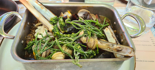 Rsvp required the place is pretty crowded. We had a girls' night out. Cool ambiance with great views if you asked to be seated with a view when you rsvp. We decided against the tapas in light of the pandemic and went straight for a dish each as it was a weekday night and all of us had to work the next day. Service was acceptable despite the crowd. It did take a while to get their attention to order...and to get our wine glasses. And when our bottle came, no one came to fill our glasses. The white wine at 27€ was acceptable, wines started at 21€. We ordered the squids inked rice with squids however we were warned that they didn't have enough squids so half the squids would be replaced by shellfish which was fine. The dishes were served very promptly and we noticed right away that the dish was cold as we,expected them to be warm since the waited held them with a towel each. It was very tasty alas mine was completely cold!! My friend's dish was lukewarm and the other dish was warm... Our waiter was a sweet chap but he was extremely occupied with other tables. We called a waiter who passed by our table to inform him that my dish was cold and he gave us a shrug. At 28€ for the dish, I expected him at least to offer to reheat the dish for me! Well, honestly we were there because there weren't many restaurants opened on Monday evenings and it was located very close to the...