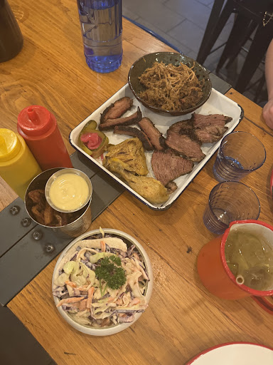 On arrive ensuite à la partie principale : le plateau à partager pour deux. Les portions de viande sont très généreuses, ainsi que pour le coleslaw. En termes de quantité, on en a pour son argent. Cependant, pour ce qui est des accompagnements, les « potatoes » sont en fait des frites de type bistrot ; cependant, celles que nous avons eues étaient gorgées d’huile, donc fatalement très écœurantes. Le coleslaw n’était pas mauvais, cependant il pêchait sur l’assaisonnement et la découpe du chou. Je conseillerais de mettre plus de sel, une pointe de vinaigre de cidre et un peu de cassonade pour l’assaisonnement, et de découper le chou rouge plus finement. La patate douce cuite au fumoir n’était également pas mauvaise, mais, comme pour le coleslaw, l’assaisonnement n’était pas présent du tout.