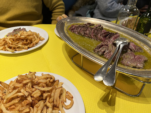 Quite the experience. The line looks crazy at first but you don’t actually have to wait for that long since the restaurant is quite spacious and can hold a lot of costumers at once. The salad they give you at the beginning is really tasty, try it with some bread. I would’ve loved more nuts with my salad tho. It also doesn’t take long for your meat to get there. The plate with the candles flaming to heat it up give a dramatic take to the whole vibe, but i have to admit they’re useless 🤷🏻♀️ The gravy is very delicious, the meat is cooked to your liking as promised but is not juicy for my liking. I appreciated the fact that the sodas are in glass bottles. The fries are well made and you get offered more as soon as your plate starts to look empty. Which leads me to talk about the staff that were very attentive and very sweet. I had a little issue with the fact that they seat you where they prefer while i would like to take a visit and choose my desired sitting area. I also tried a desert, fondant au chocolat fait maison, and i totally recommend it. It is everything you want from a fondant, very moist and is drained in sauce. I quite enjoyed every bite of it. The wine is also very tasty, i didn’t ask which brand they served me, but the alcohol tastes kind of strong, which i enjoyed in both white and rosé. I would suggest that maybe they play music to make the experience even more enjoyable. I totally recommend trying...