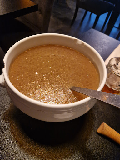 A little expensive especially when half of the main courses on the menu require a supplement but quantity is very satisfying. The soup came in a huge bowl but we were not fans of the soup, tasted just like beef broth to us and felt like there was something lacking. Salad was great, very well prepared. We got the magret canard which was also tasty, and very tender meat but also lacked a bit of sauce somewhere? The desserts were decent. They also have a good selection of wine though we didn't order any but should be heaven for wine lovers. Overall satisfied but probably would not return since the menu doesn't seem to change. The restaurant was also very hot and stuffy and didn't make eating...