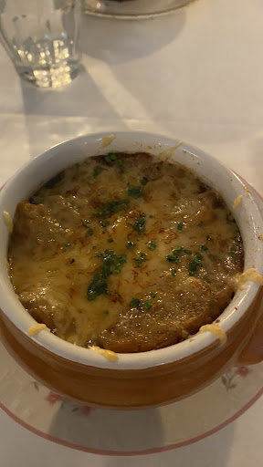 I started with the French onion soup, which was rich, flavorful, and perfectly comforting. For the main course, I had the jambon rôti accompanied by two different types of pommes de terre gratinées. The ham was well-cooked, juicy, and full of flavor, while the gratins were creamy and satisfying. Due to a slight delay in service, the waiter kindly brought me an extra portion of potatoes, prepared differently—an unexpected but much-appreciated touch.